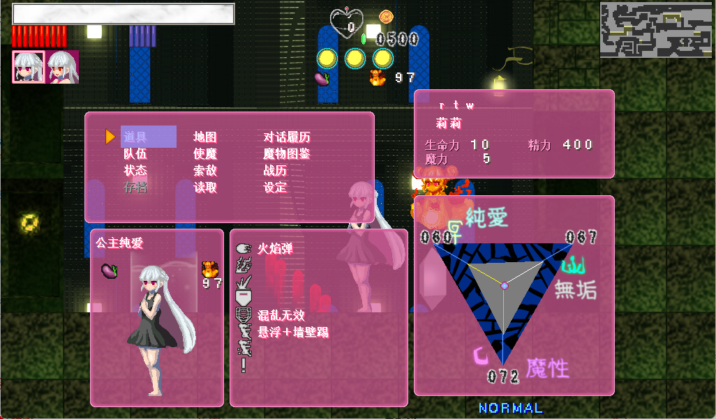 菜单里重要的有道具、地图、队伍、使魔、魔物图鉴和状态。右边的三角形是女主三个形态目前的相性(?),相性似乎会影响将魔物收作使魔的概率。魔物图鉴里可以查看魔物的相性。队伍可以安排形态的顺序,按下S时是按队伍顺序进行形态切换的。