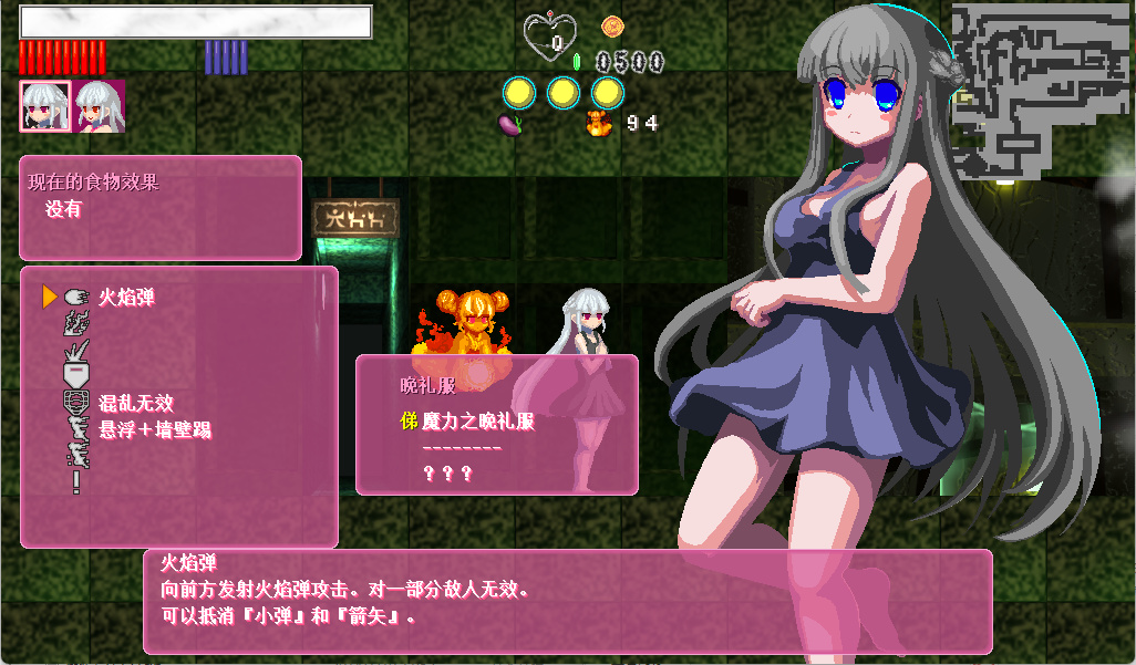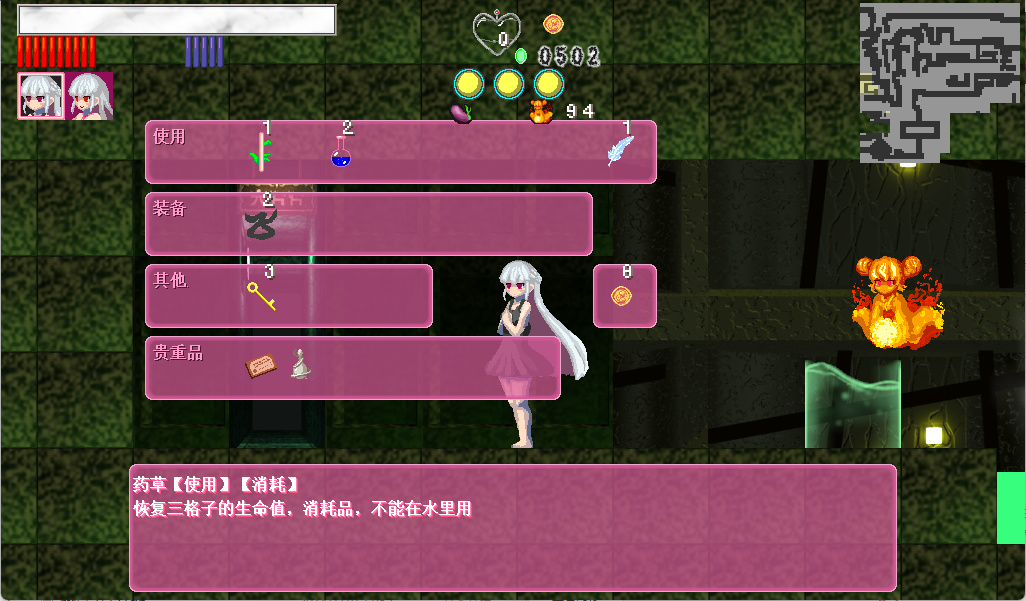 这是游玩时的操作界面左上角的白色槽是精力槽,在男主与他人交流时会消耗,随时间或泡温泉恢复。红色的是血条,蓝色的是魔力条,当魔力条没了的时候男主会由女性形态变回男性形态,血条没的时候会被传送至安全地点并回复一半的血条。血条下面是显示目前所处的形态,随着探索会找到更多的可切换形态,每个形态都有不同的攻击方式和特点。