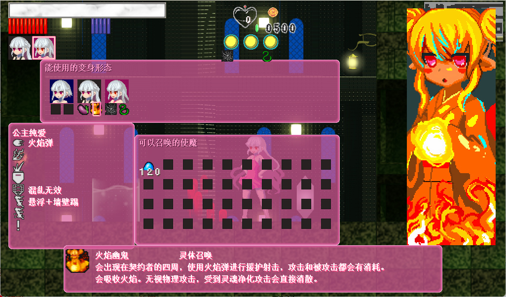 中间的500是钱;钱下面的黄色圆圈就是宝石,宝石可以在没有蓝条的时候强行变身回满蓝条或者用于放大,不同形态的大招也不同;宝石下面是当前形态使用的使魔。
