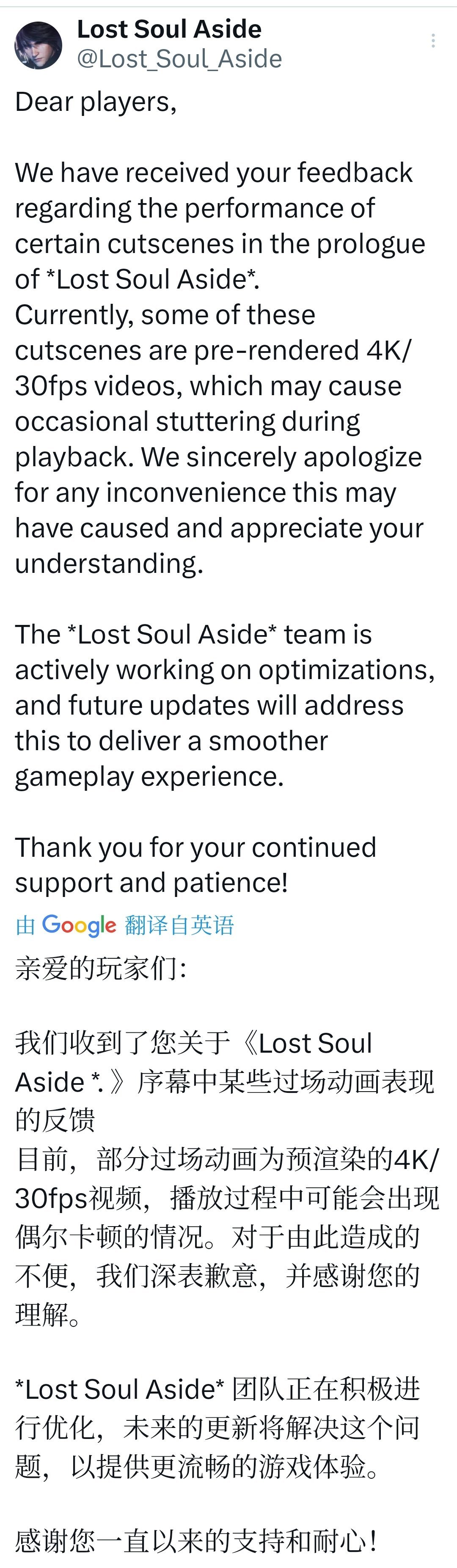 針對玩家的反饋,Ultizero Games在發售當天通過X發佈致歉聲明,承認了遊戲在優化方面的問題,特別是過場動畫的性能問題。官方表示: