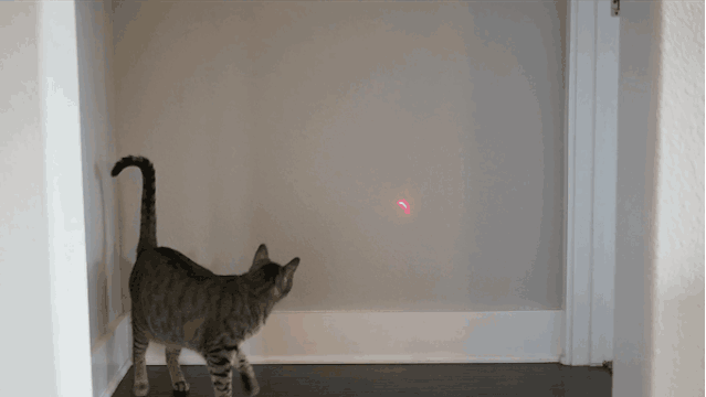 具体是用手持式(现在似乎有自动的)激光设备产生的光斑,然后移动激光产生的明亮的图案,光以不规则的方式吸引着哈基米和其他追逐本能的动物(据说狗不喜欢),引导到猫附近的地板或墙壁或其他不透明表面上。