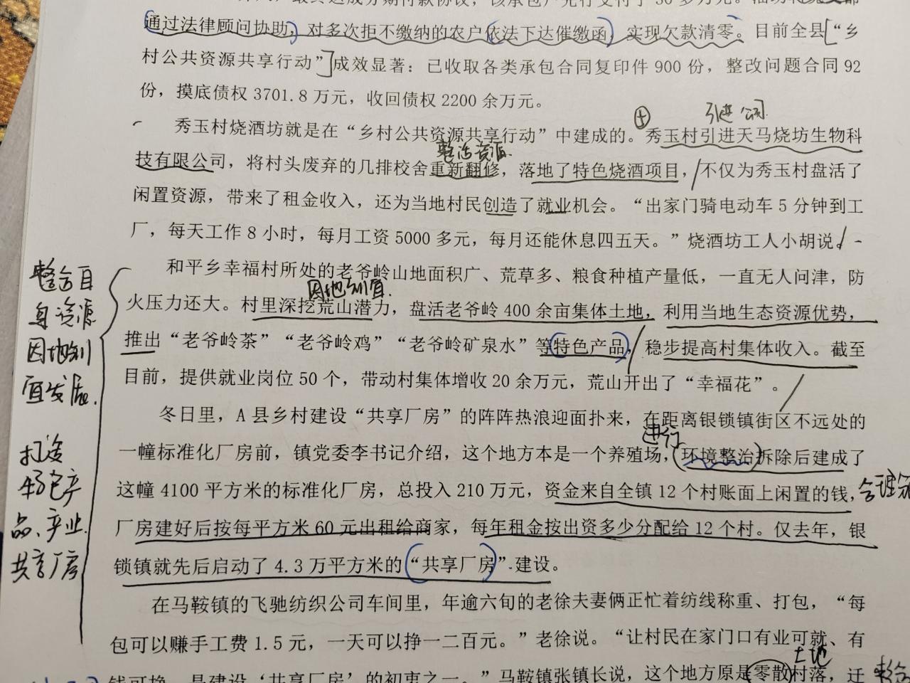 考题无非也就围绕这些展开,比如概括A村脱贫致富的做法。就是考我们用了什么办法,值得一提的是我发现身边好多人分不清做法和作用,经常把作用抄进去。其实无伤大雅,但是容易浪费格子,这里和大家分享一个我区分两者的邪修路子。