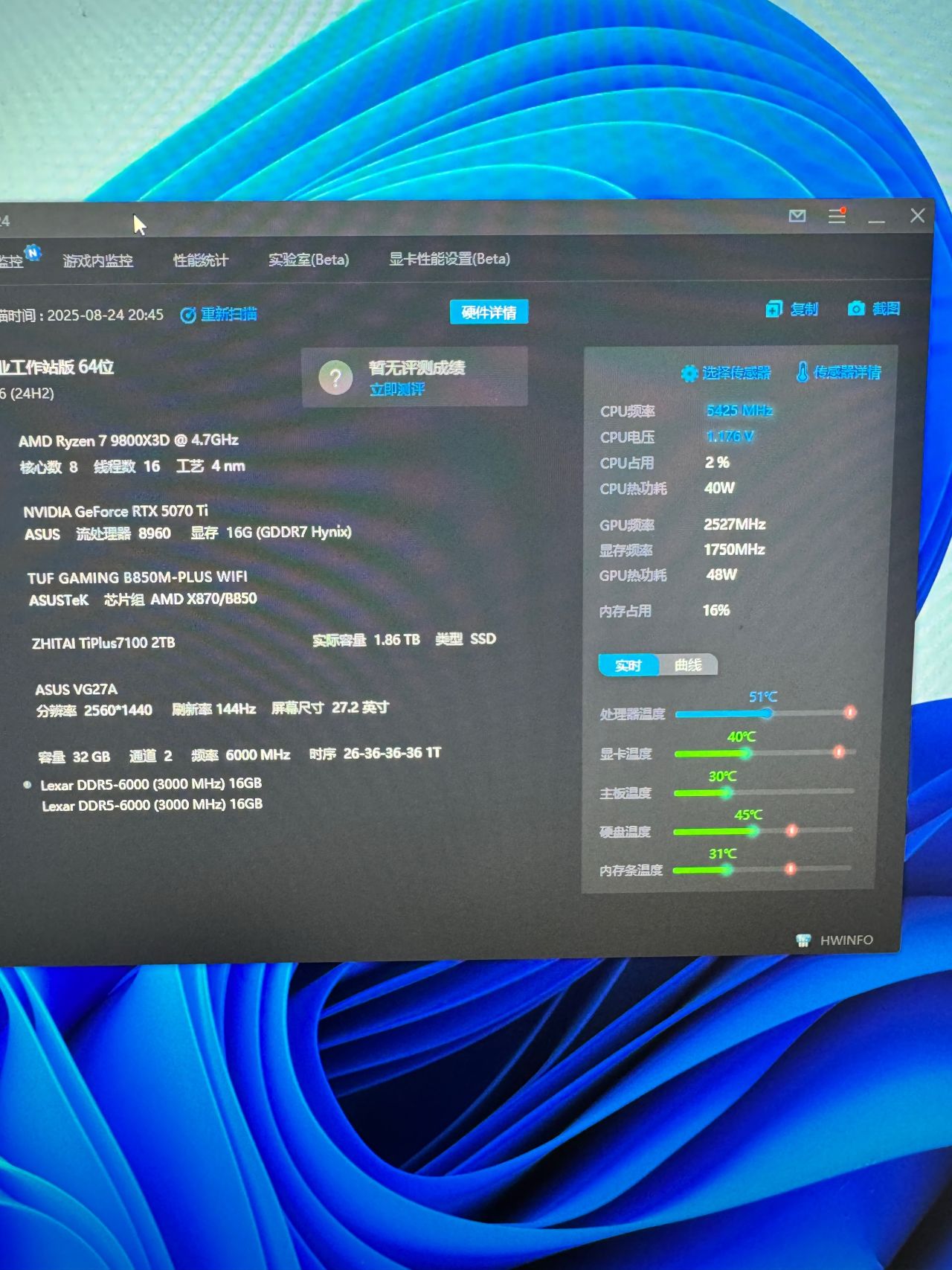 游戏加加识别跑满 54.25MHz,室温28.7度,各个硬件温度表现不错。