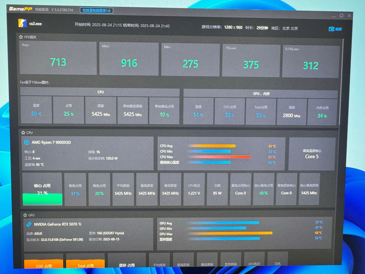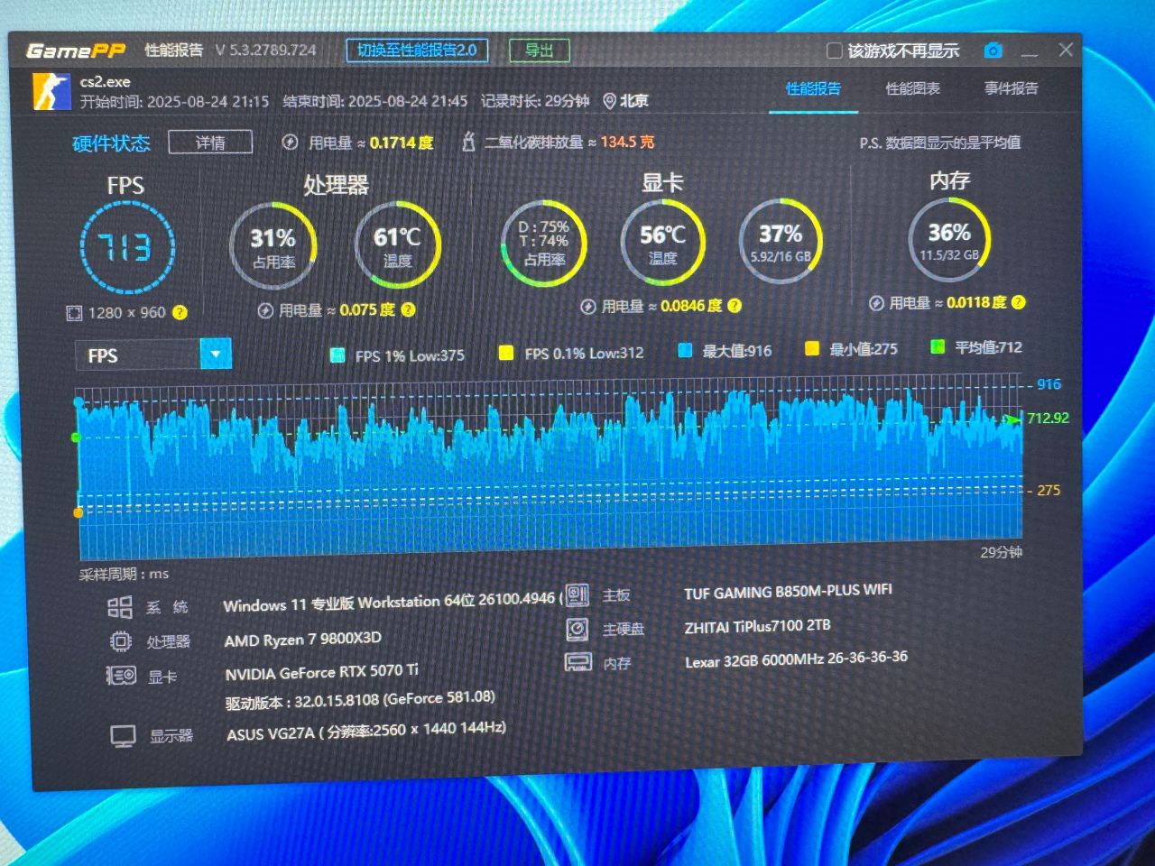 平均FPS 高达713FPS,1% Low 高达375 FPS,0.1% Low也高达312 FPS 。