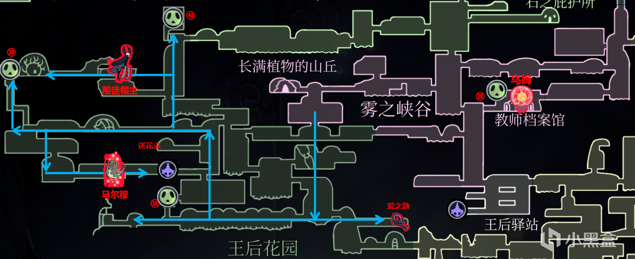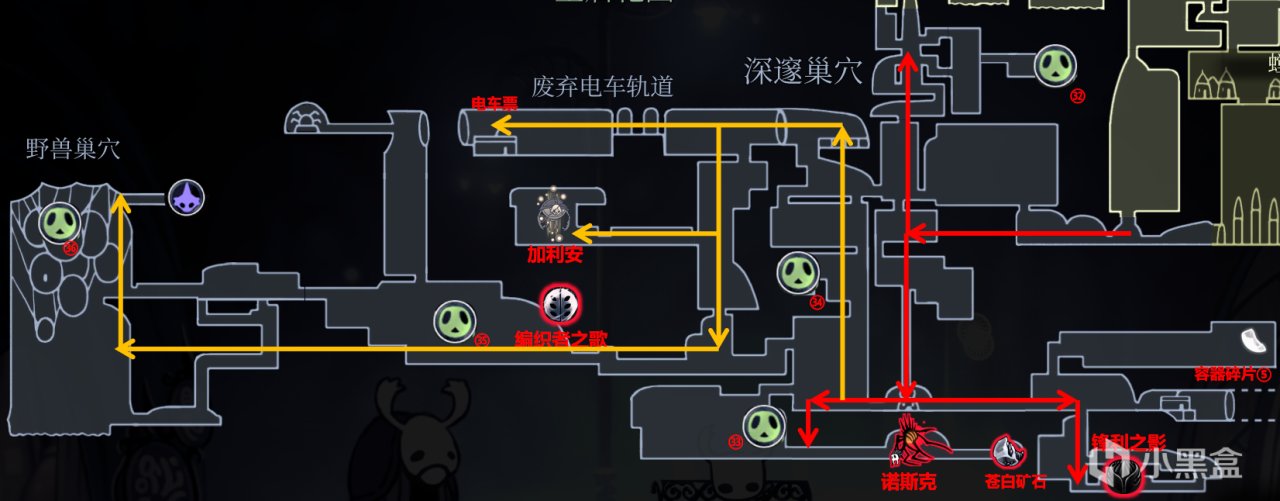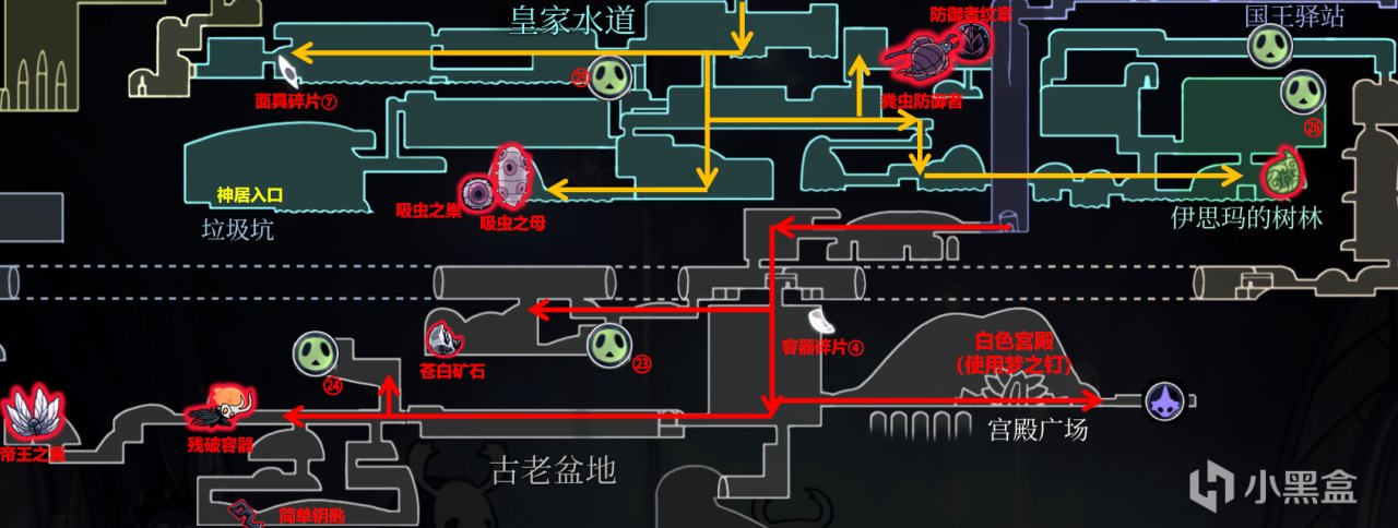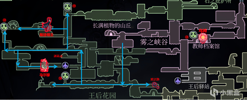 ⑬王后花園 獲得愛之匙 開啓王后花園鹿角站 這裏和鹿角蟲對話會解鎖鹿角蟲巢穴鹿角站 到達鹿角蟲巢穴 獲得容器碎片(6) ★★容器碎片集齊