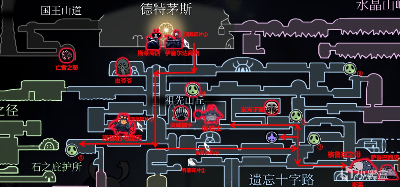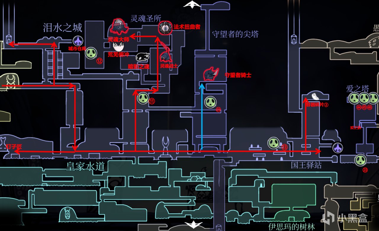 ④淚水之城 跳跳樂後使用城市紋章開啓大門 開啓城市倉庫鹿角站 這裏往左大電梯會回到遺忘十字路的底部獲得容器碎片(1) 可以先去釘子匠那第一次強化 上靈魂聖所 頂部獲得護符【法術扭曲者】 擊敗BOSS(05)【靈魂大師】獲得能力【荒蕪俯衝】(白砸) 開啓國王驛站鹿角站 獲得容器碎片(2)