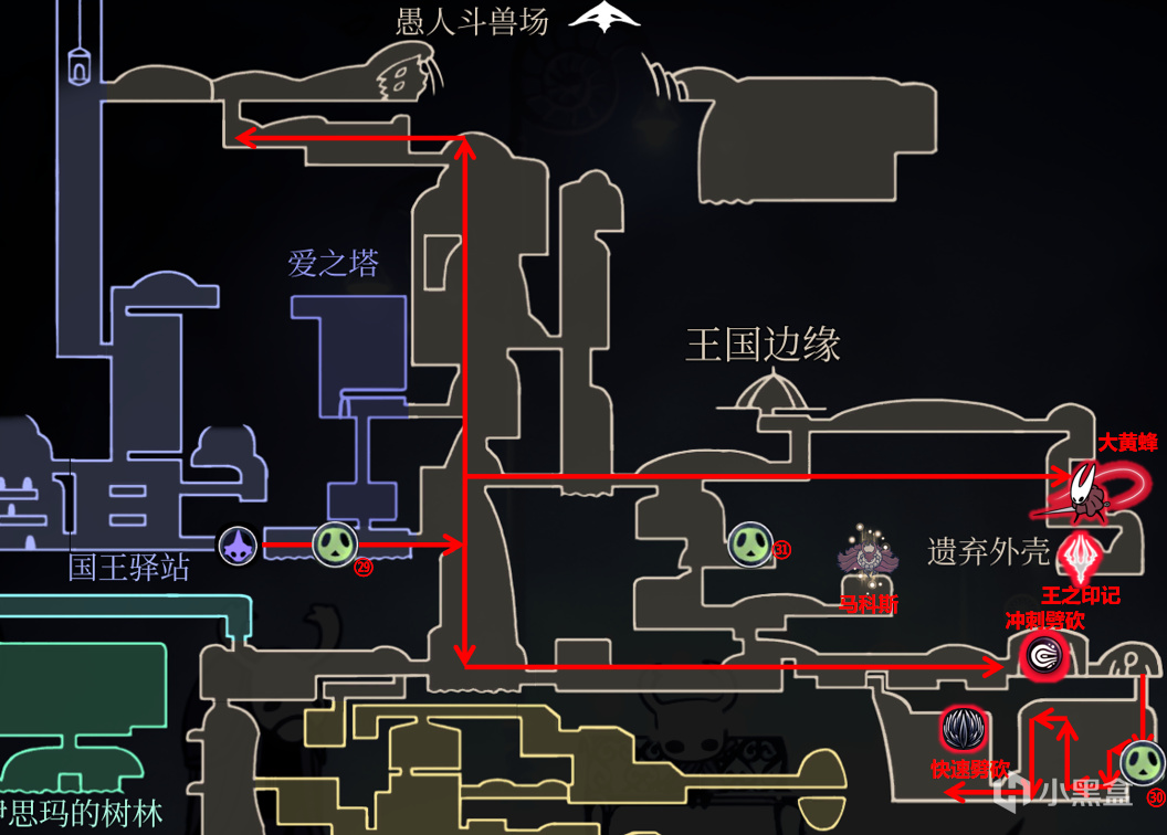 ⑩王國邊緣 王國驛站鹿角站往右 獲得骨釘技【衝刺劈砍】 獲得護符【快速劈砍】 回斯萊處獲得護符【骨釘大師的榮耀】 擊敗BOSS(10)【崗哨大黃蜂】 獲得【王之印記】