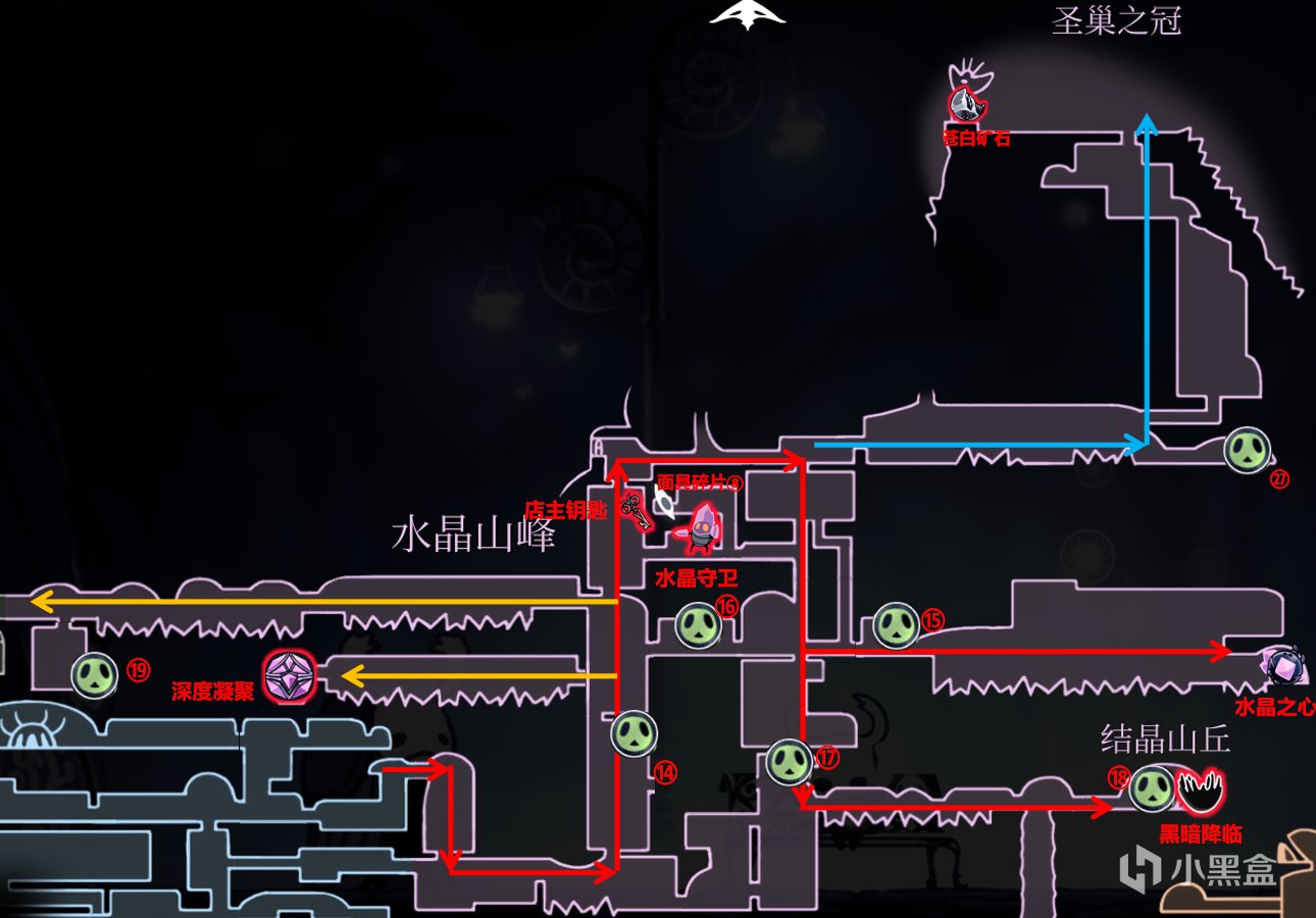 ⑤水晶山峯 斯萊那買個光蠅燈籠 由迷失十字路進入水晶山峯 獲得店主鑰匙 擊敗BOSS水晶守衛 跳跳樂獲得能力【水晶之心】(超衝) 進入結晶山丘獲得能力【黑暗降臨】(黑砸) 一路穿過激光陣獲得護符【深度聚集】