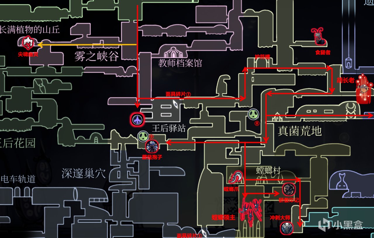 ③真菌荒地 開啓王后驛站鹿角站 頂部獲得護符槽 進入螳螂村獲得能力【螳螂爪】 底部擊敗BOSS(04)【螳螂領主】(血厚可以跳過等到淚水之城升級骨釘)擊敗後往左獲得面具碎片(1) 往右獲得護符【驕傲印記】 右下獲得護符【衝刺大師】 護符再往左跳跳樂找到布蕾塔 回到王后驛站 右側獲得面具碎片(2) 回布蕾塔屋子獲得面具碎片(3) 最後到左邊的霧之峽谷獲得法術【嚎叫幽靈】(白吼)