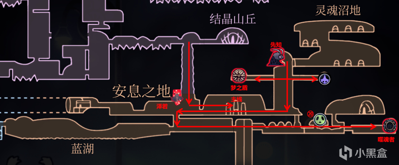 ⑥安息之地 下來觸發主線劇情 傳送到先知處 獲得能力夢之釘 下來獲得護符【夢之盾】 開啓鹿角站 下拉擊敗戰士之夢(1)【澤若】 獲得護符【噬魂者】