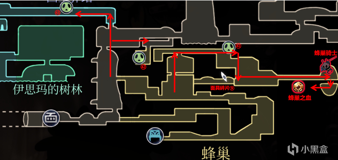 ⑭蜂巢 面具碎片(9)需要勾引蜂巢守衛撞牆 擊敗BOSS(14)【蜂巢騎士】 獲得護符【蜂巢之血】