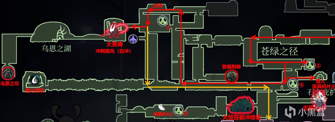 返回蒼綠之徑 石之庇護所擊敗戰士之夢(2)【無眼】 再往右到底獲得面具碎片(6) 再往左擊敗BOSS大型苔蘚衝鋒者 獲得容器碎片(3)