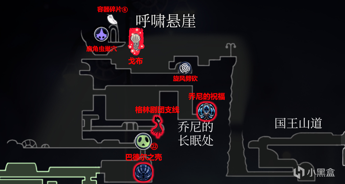 ⑦呼嘯懸崖 從德特茅斯或者蒼綠之徑走都沒有區別 一次性把這裏清空就行了 喬尼的長眠處獲得護符【喬尼的祝福】 打開寶箱進入隱藏區域獲得護符【巴德爾之殼】 獲得骨釘技【旋風劈砍】 擊敗戰士之夢(3)戈布 用夢之釘觸發格林劇團支線 回德特茅斯一直做任務 最終會擊敗BOSS(16)【劇團團長格林】和(17)【夢魘之王格林】