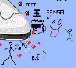 放大之後這幅畫的周邊,除了無數紅心之外,你可以看到許多抽象表情包,其中以腳部最爲密集,很明顯這些足控有相當一部分是國內流出的,證據就是旁邊一句句“今日要聞”和“玉”。