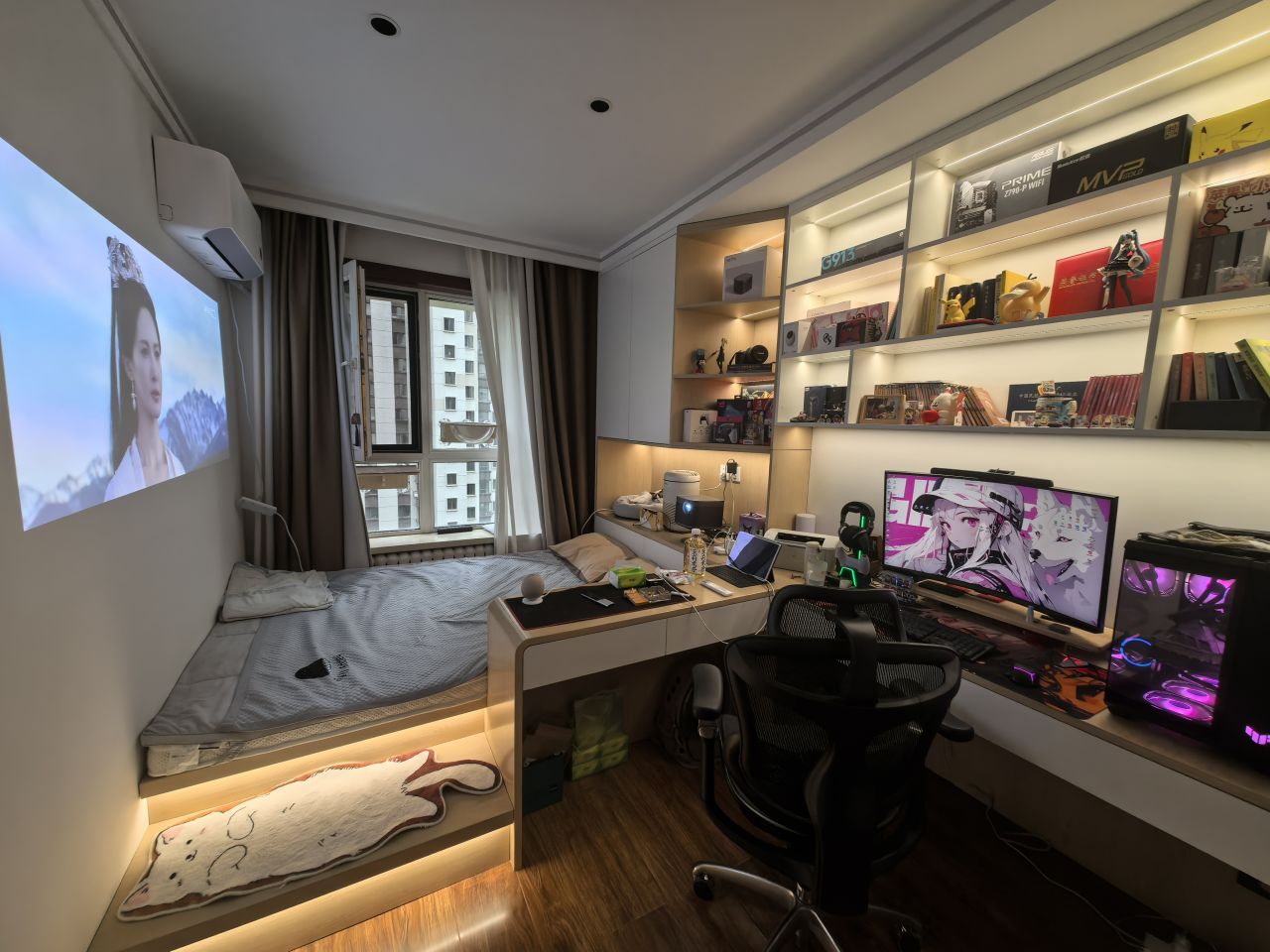 零零碎碎都添置上,把东西都摆上。一个舒适惬意的电竞房就出现啦!密集型的布局,可以满足居住、娱乐所有需求!
