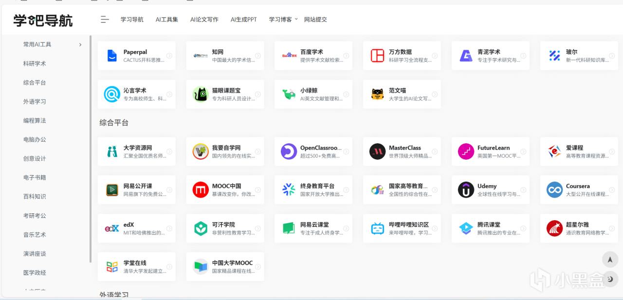 “学吧导航”是一个非常知名的学习资源聚合网站,覆盖了从小学、中学到大学、考研、留学,再到IT编程、设计、外语、职场技能、兴趣爱好(如音乐、美术)等终身学习的各个方面。将互联网上优质、免费的学习网站、工具平台、课程资源等进行系统地收集、分类和整理,方便用户快速查找和使用。