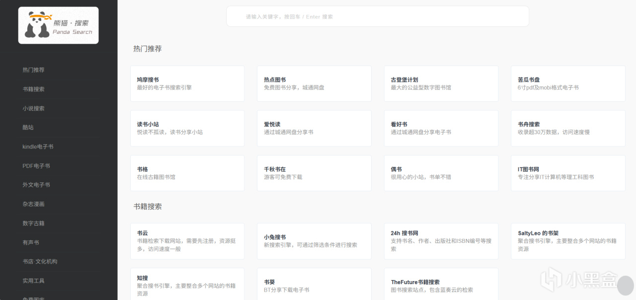 “熊猫搜书”是一个非常受欢迎的电子书资源聚合搜索网站或导航站。它会一键调用国内外数十个知名的电子书网站(如zlibrary、苦瓜书盘、鸠摩搜索、Library Genesis、Manybooks等)的搜索接口,并将所有结果汇总在一个页面上。省去了逐个网站去搜索的麻烦,极大提高了找书效率。