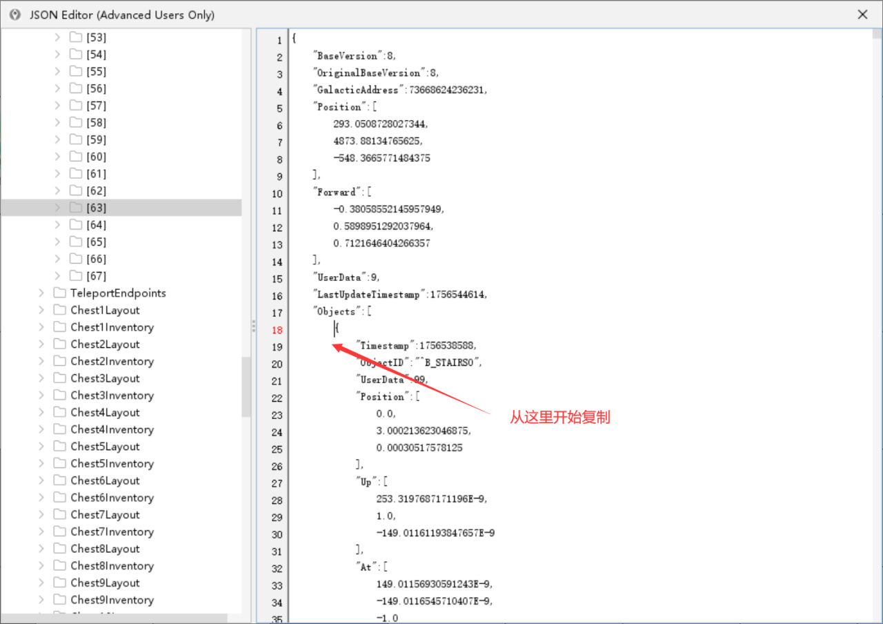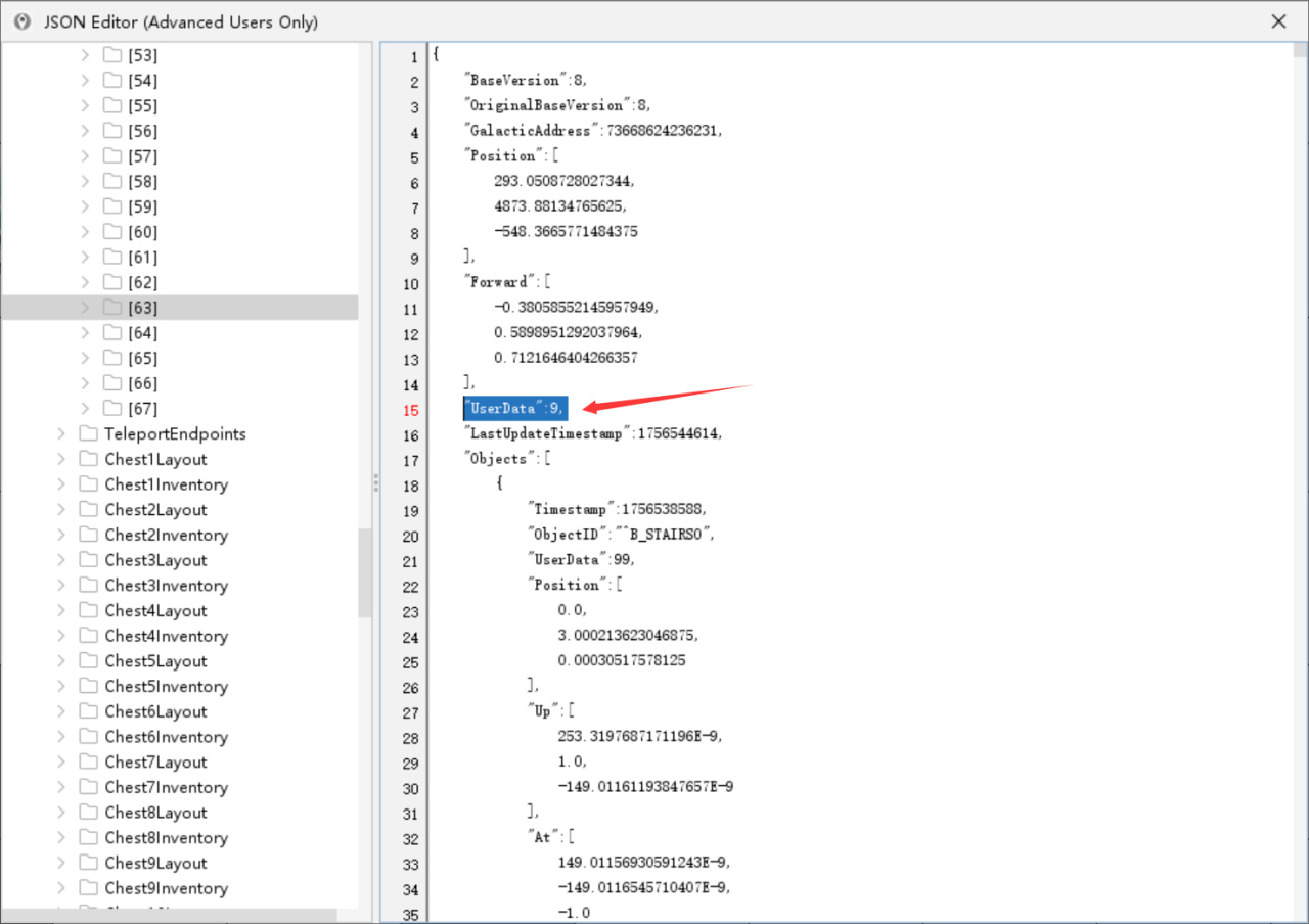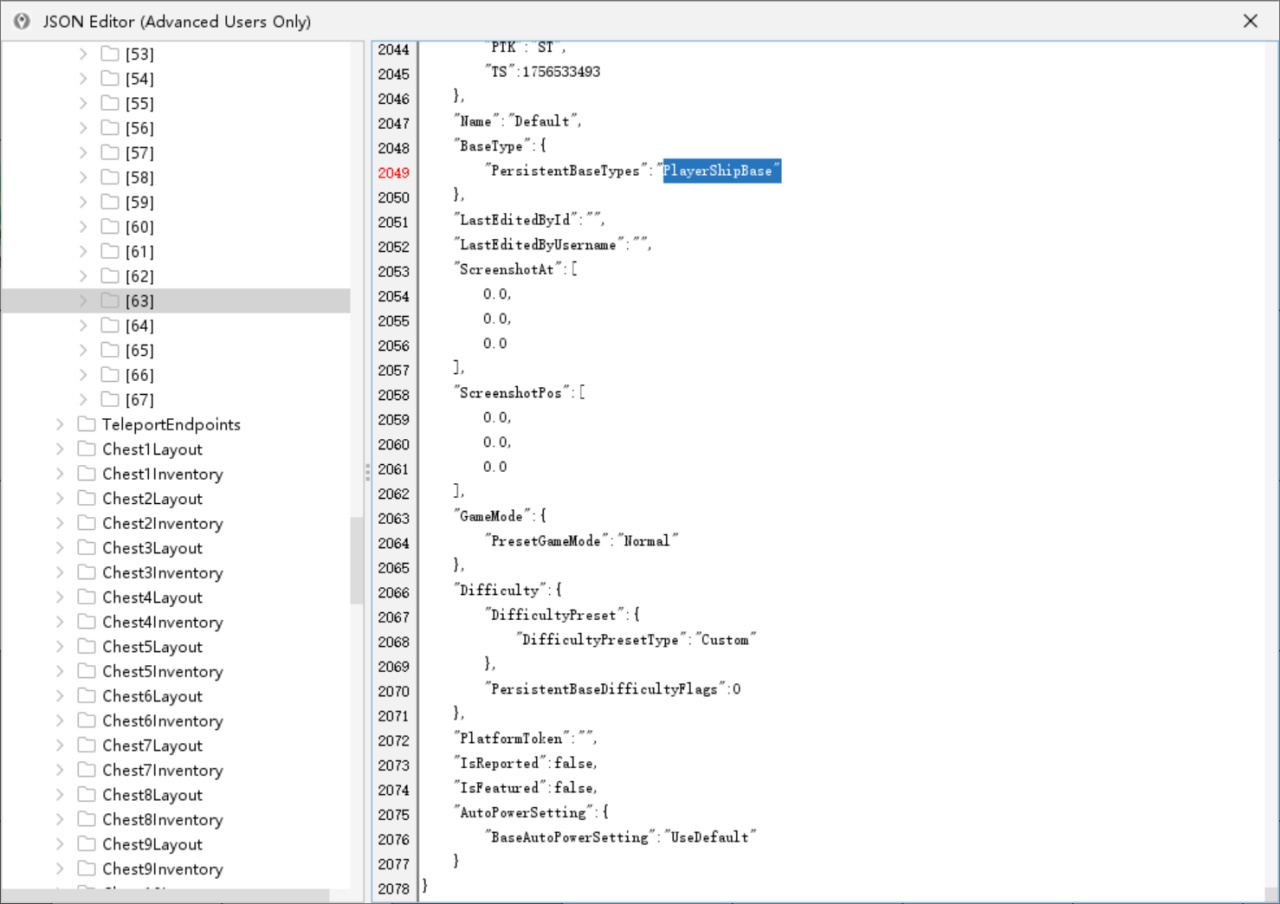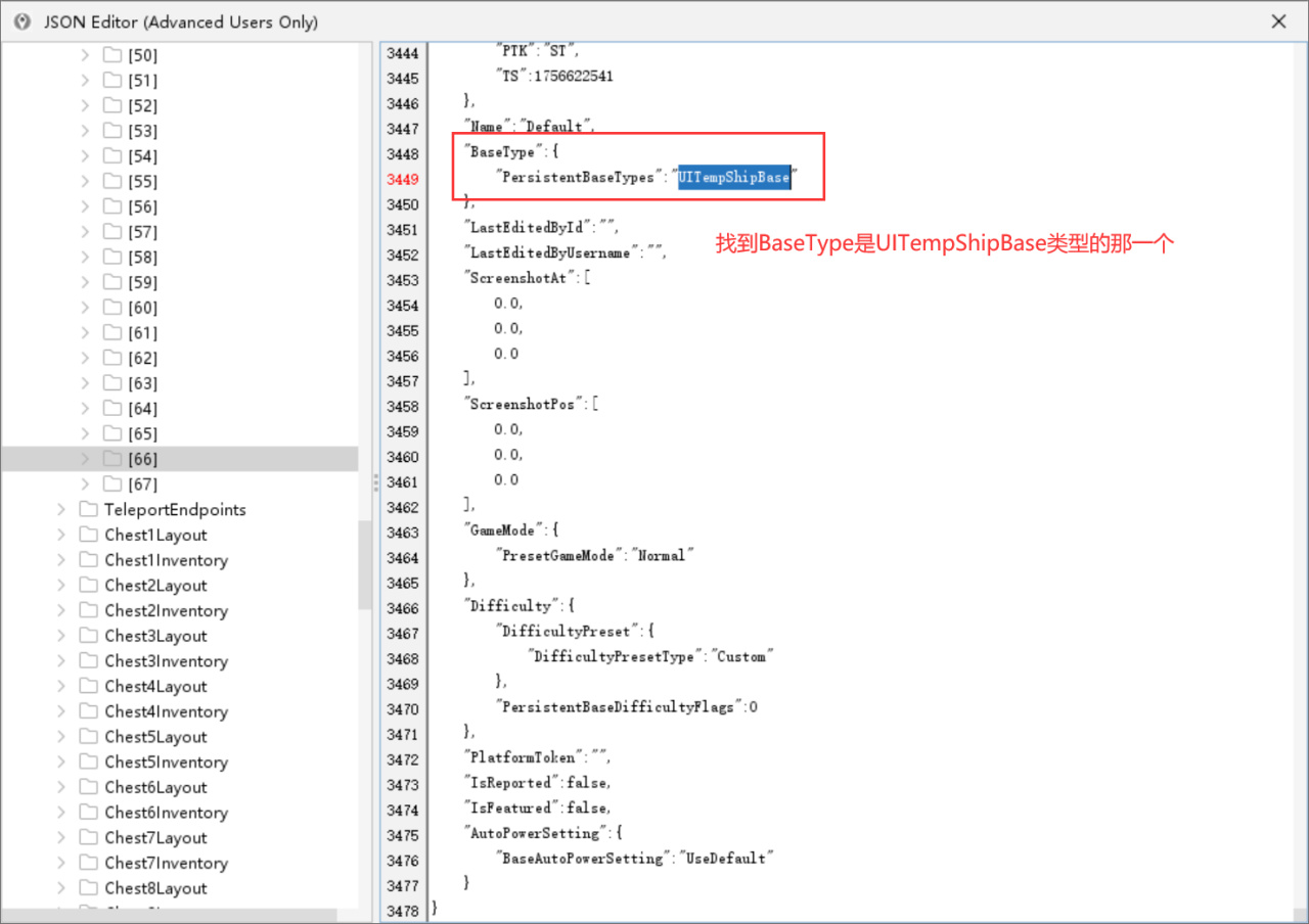 接下来展开PersistentPlayerBases,会看到很多数字,一个数字就是一个基地。建议从后向前找,点击数字之后翻到json文件最后面,我们要找的就是PersistentBaseTypes是UITempShipBase的那一个。