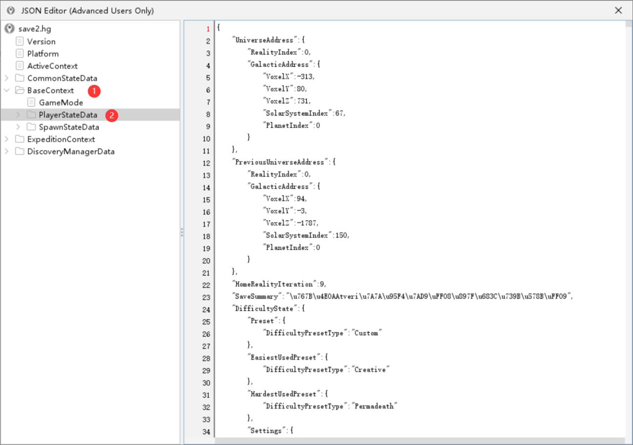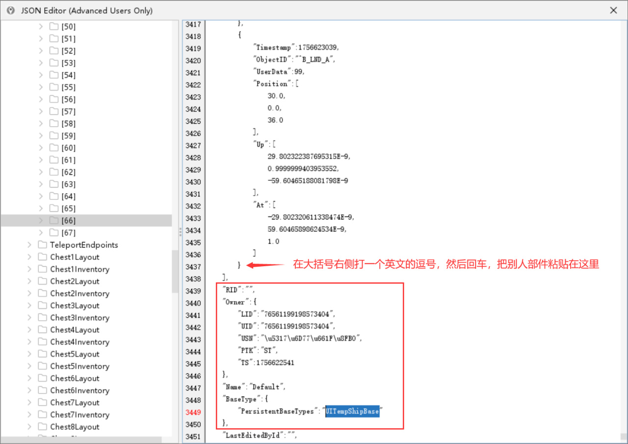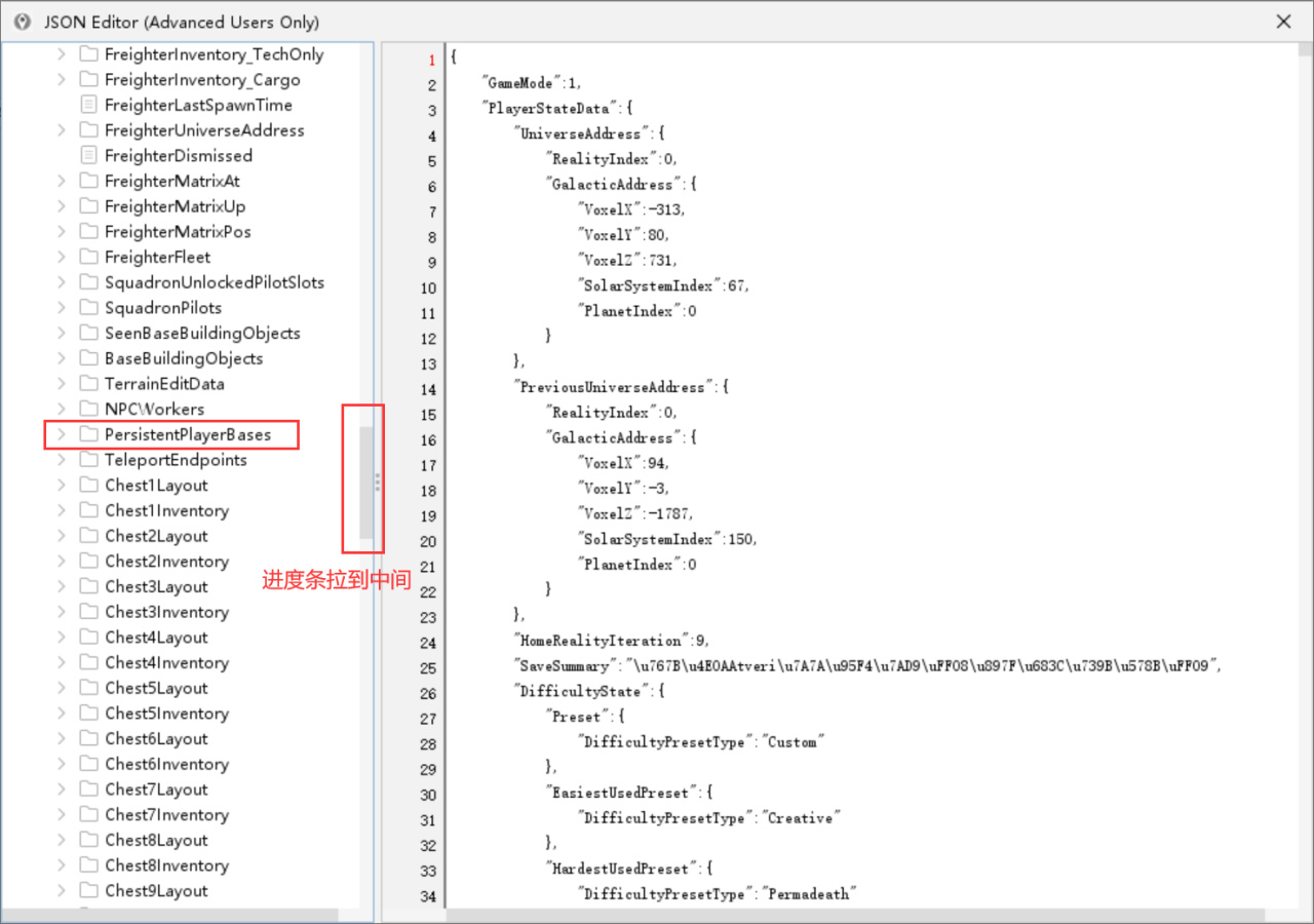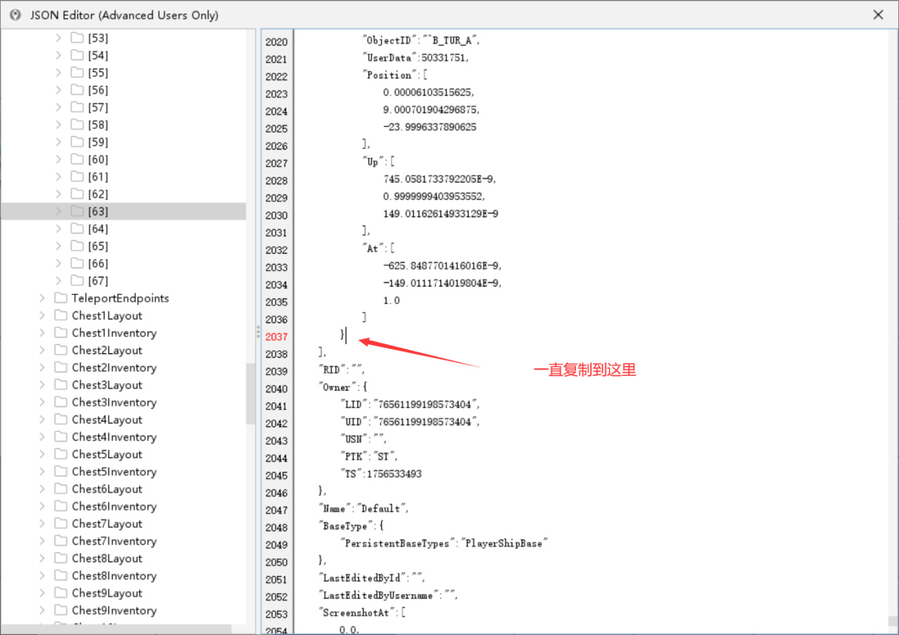 接下来展开PersistentPlayerBases,会看到很多数字,一个数字就是一个基地。建议从后向前找,点击数字之后翻到json文件最后面,我们要找的就是PersistentBaseTypes是UITempShipBase的那一个。