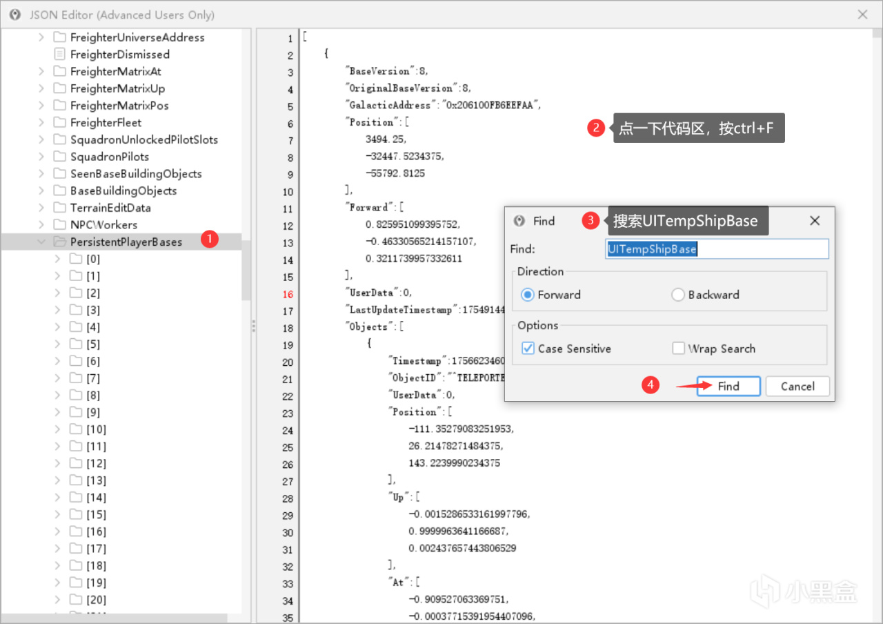 如果真的找了好久都没找到,还有个办法。先在左侧点击PersistentPlayerBases,然后在右侧代码区域按crtl+F搜索。这样也能找到,只是没法知道是第几个基地文件。