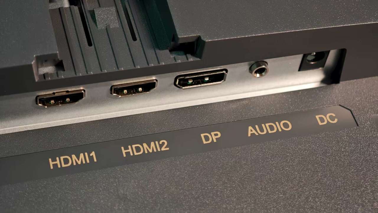 显示器接口为双HDMI2.0、一个DP1.4口、3.5mm音频口和DC电源口,附送DP线材。