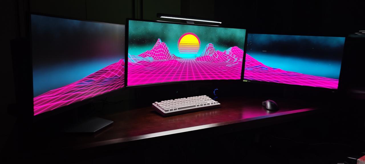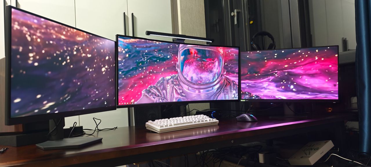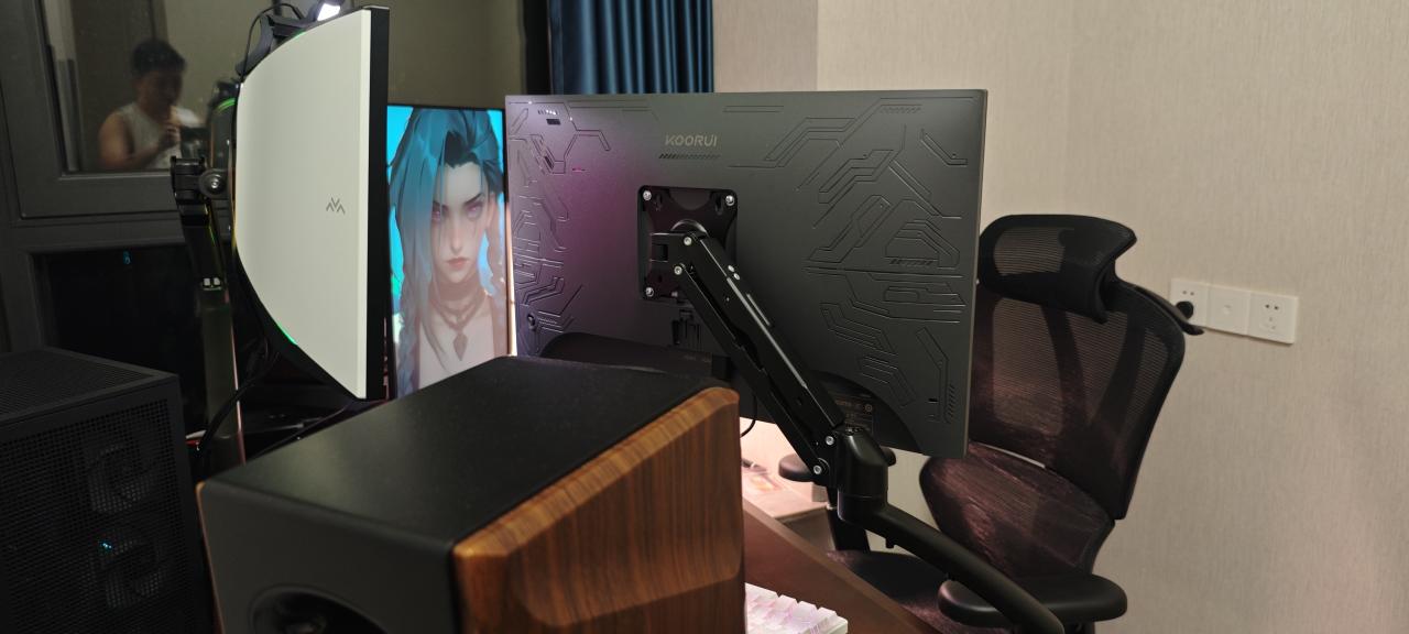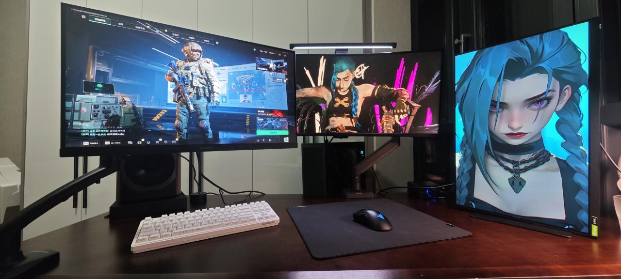 科睿X5被我布置在最左侧,用显示器机械臂支撑。玩FPS游戏时,就将带鱼屏推远,科睿X5拉近做为游戏显示器畅玩。因为它是刷新率最高,叠加小屏尺寸,游戏体验也最好!