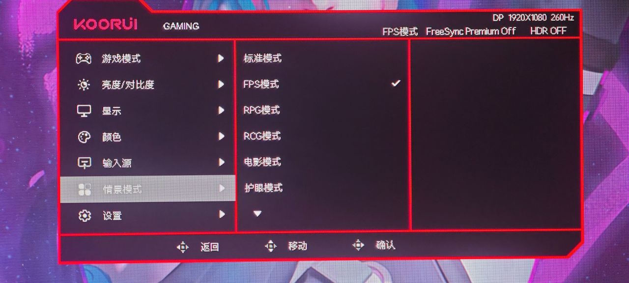 显示器为摇杆操控,相对老式电视按键更方便。提供有多种情景模式,能省事一键切换FPS、电影、护眼等模式。