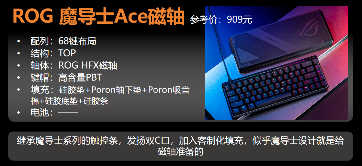 魔导士ACE HFX,魔导士ACE作为ROG 首款磁轴,继承了之前魔导士系列的触控条,发扬了双C口,而且还有客制化填充。