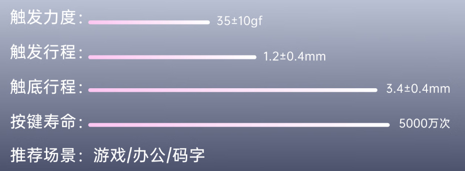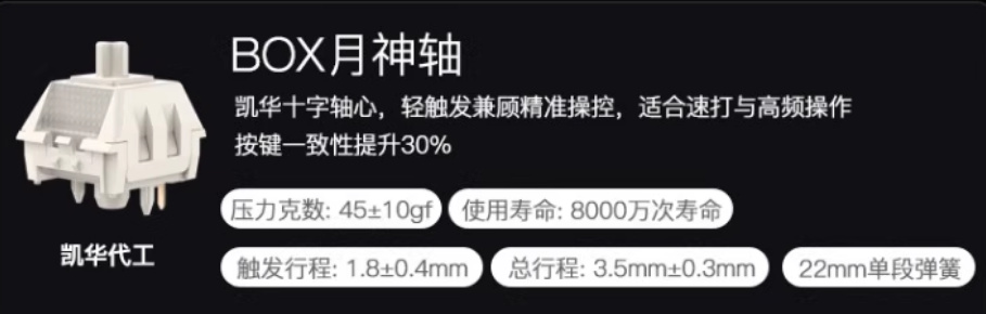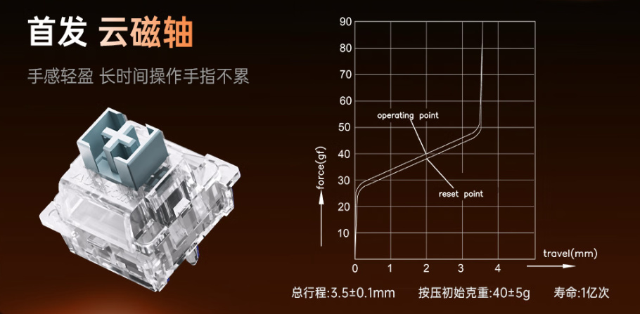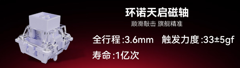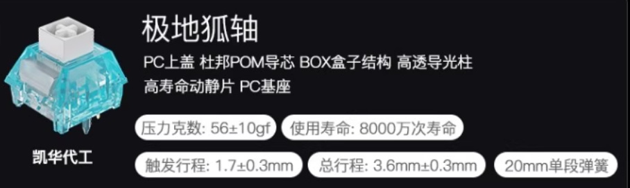 用的轴体为ROG的HFX 第二代磁轴 POM材质+PC上盖,一亿次寿命,初始压力比较小。长时间用手指不累。