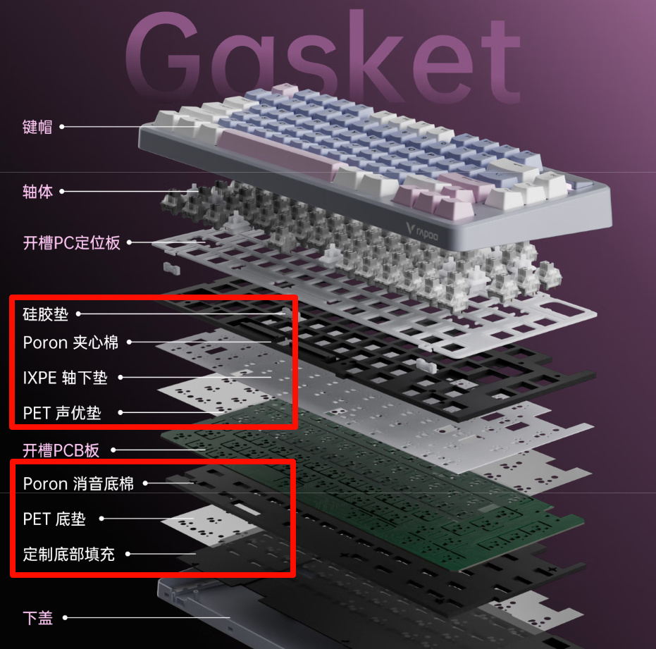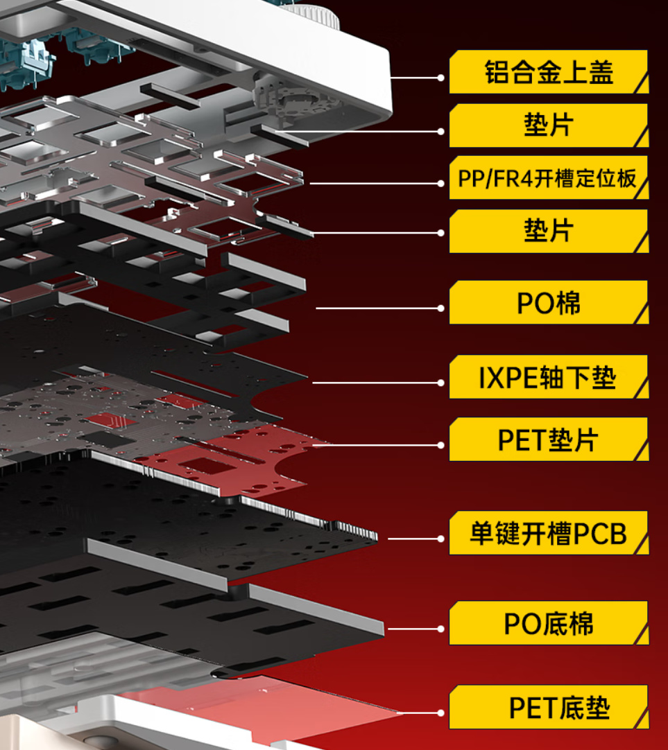 消音填充有4层,硅胶垫,PO轴下垫,PO吸音棉,再加硅胶底垫,两层棉两层硅胶。