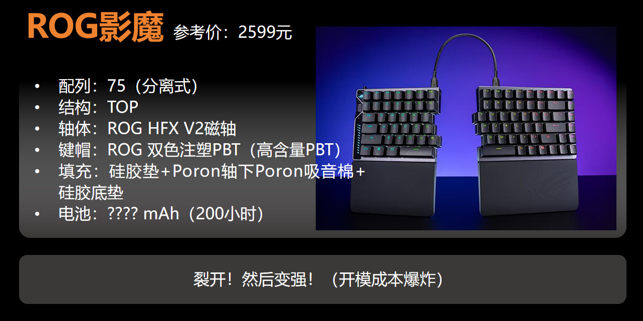 说真的,影魔这把键盘挺有争议的,分体式设计确实很有特色,但是价格也来到了2599,而且价格相当坚挺。