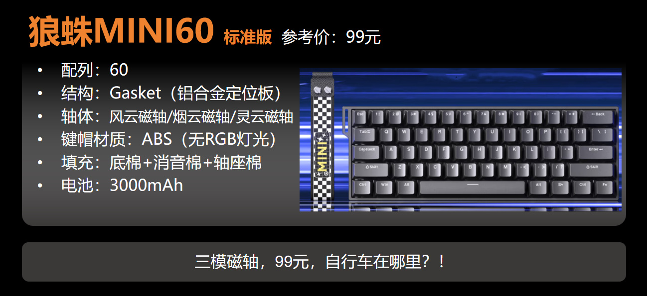 这个键盘更多的是在【100块钱以内】【有货】的磁轴键盘里面不错的。但很多人说,哎呀,键盘99的有很多,为啥一定要选你这个塑料壳子,啥都没有的。因为mini60这是三模磁轴!