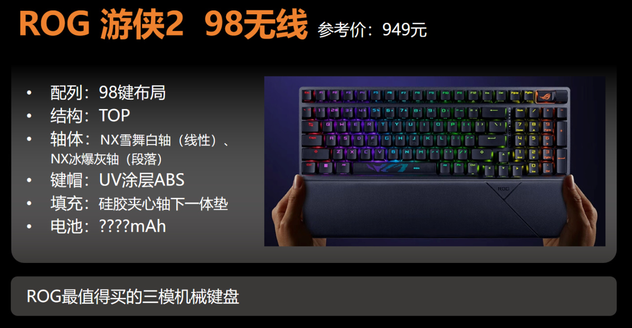 这个是之前ROG游侠98无线版的升级款,三模连接+98配列+Omni双设备连接+多功能三方向旋钮+ROG PBT键帽(懂不懂一套249元键帽的含金量?)+自带掌托这些通通保留,而且还更新搭载了ROG定制的RX光轴,线性的RX红轴和段落的RX蓝轴。手感都极其接近机械轴。