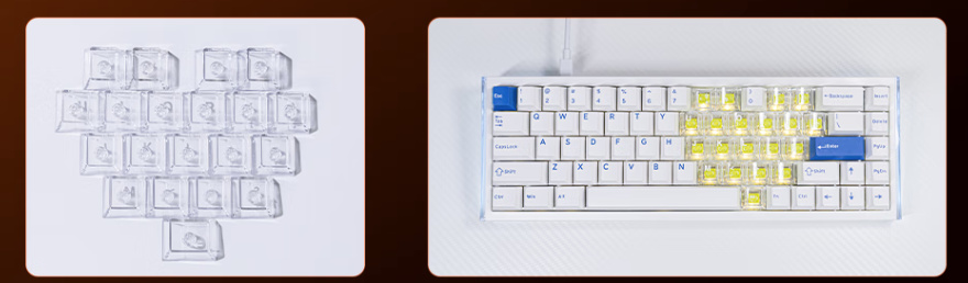 然后这把键盘给到的也是自家高含量PBT键帽,而且还做了字透,相当好看。
