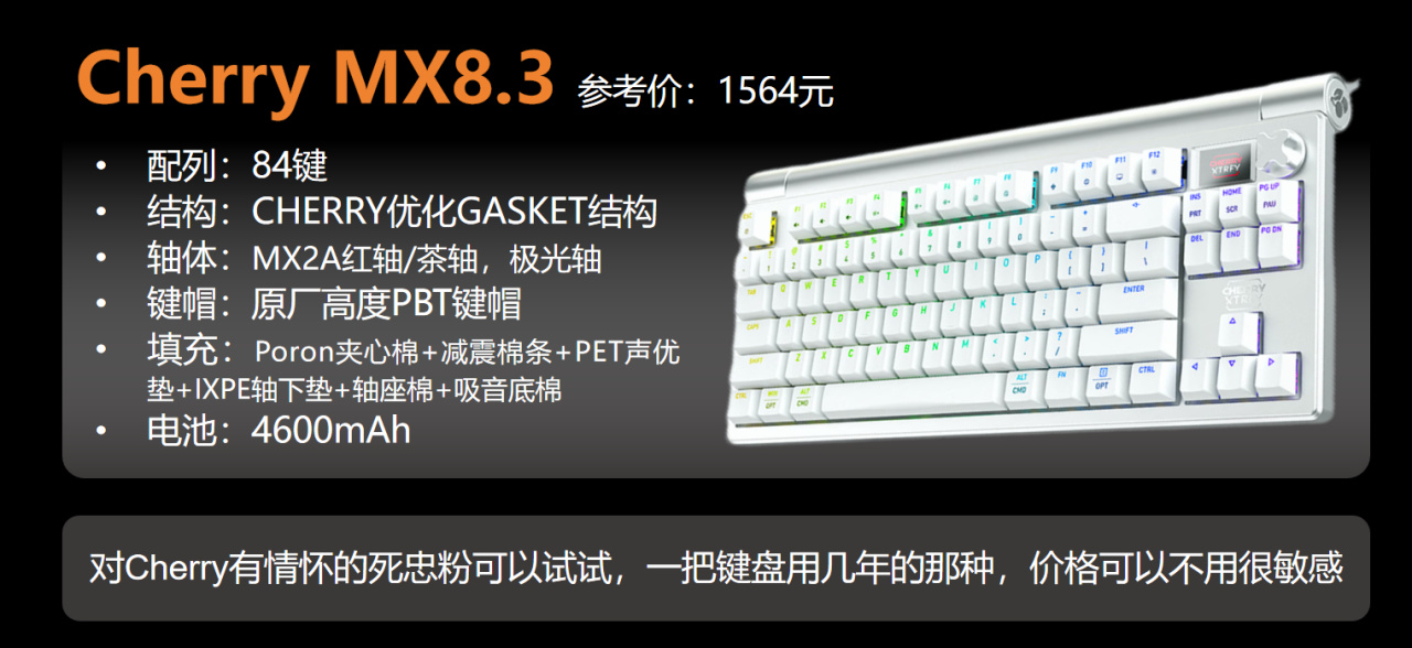 老Cherry又推出了新产品,这次是MX8.3是全新的键盘。设计非常有特色。基本就是客制化键盘了,但是采用的是全新的模具,并非使用传统的两段脚撑,而是使用背部的转轴脚架,做到无极调整坡度。