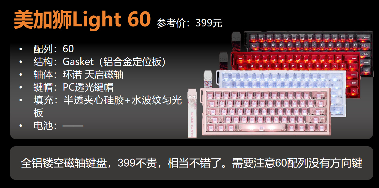 没灯光,ABS键帽都不是问题,甚至把方向键去了都能接受,反正是60配列又不是不能用。