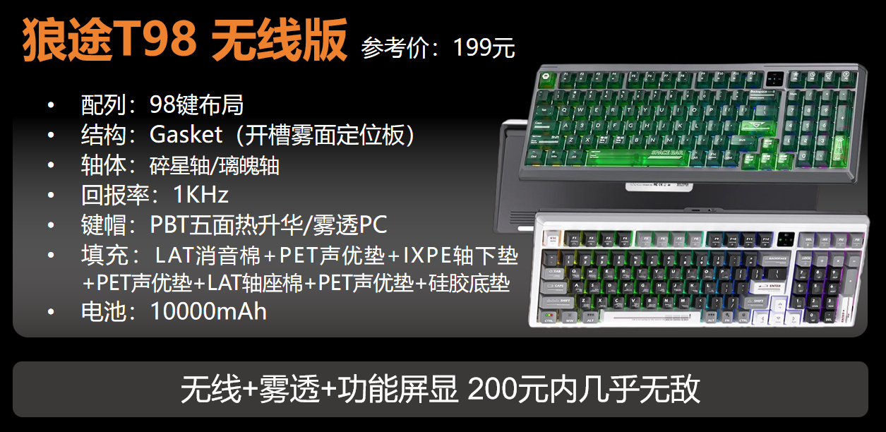 如果你手里没第一把键盘,兜里就200块钱,想买个好点的,以性价比取向,不是那么在意做工的话,选凌豹这个K98不会有错。