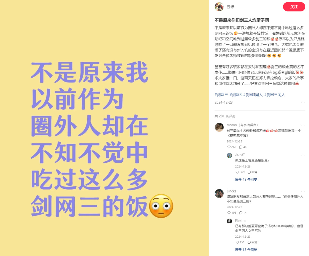 執行製作人餘玉賢在前段時間就提到,「《劍網3》的拉新方式並不同於主流市場,一直靠同人文化和生態種草,因此留住老玩家和進來新玩家其實是同一件事」。所以《劍網3》之所以能夠在過去十六年來都能保持長壽,也離不開同人生態上的繁榮。