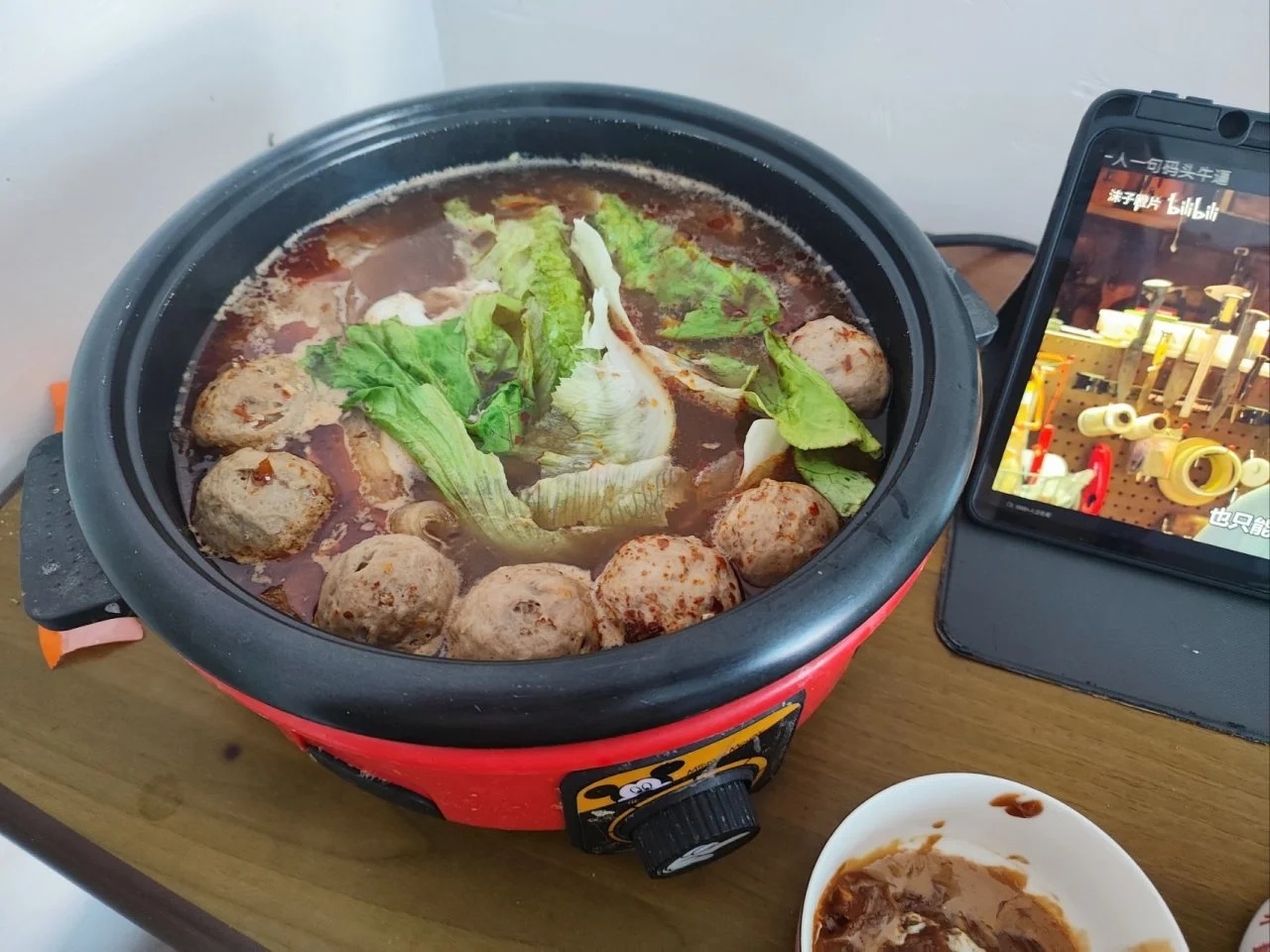 我住过来之前跟一个舍友商量一块买了个冰箱,结果搬过来发现他们根本没用过,连电源都没插。我平时自己做饭吃,得用到冰箱。我从以前的出租屋里带回来了电热锅,电饭煲,电热壶,还有个火锅。平时想吃什么都能自给自足,还能省下不少钱。省下的饭钱差不多都够房租了。