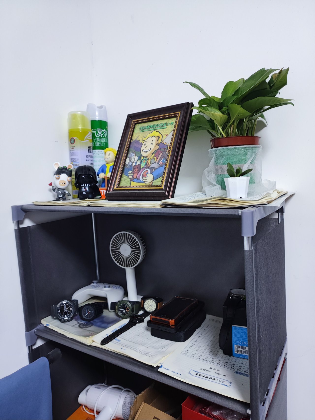 我自己买了个简易柜子,拼了我一个小时。有了柜子我室内的杂物终于能有个归宿了。我也能把我的手办和相框摆在上面。我还在美团买了一盆绿植,给我的小屋增添一份绿意