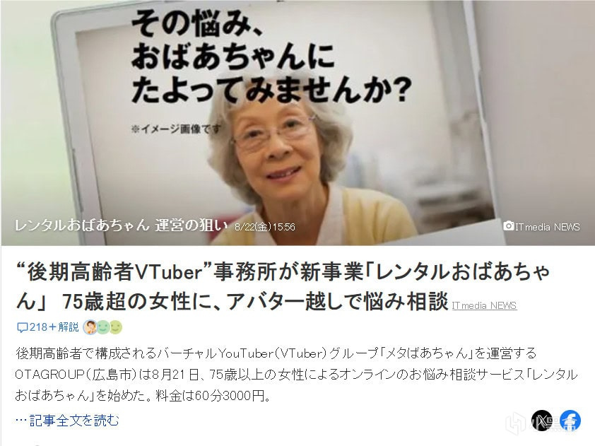 但不得不說,“租賃虛擬奶奶”這樣的舉措,確實能在一定程度上緩解老年人的孤獨,也能爲不少原子化的日本年輕人提供疏解渠道。這倒是比原本的“元宇宙奶奶”更進一步——畢竟,原本的直播還是太“商業”,也太“公開”,某些話語實在難以傾訴。而大多數時候,人們也還是在感慨老年Vtuber對時代的追逐。