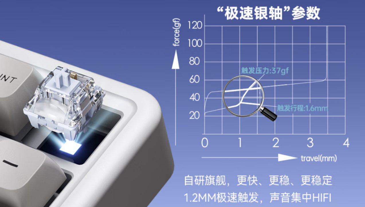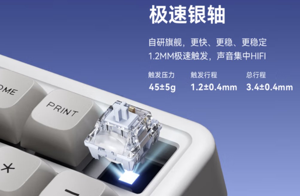 轴体是我选择这款键盘的另外一个原因。这款键盘是阿斯盾自研的极速银轴,宣传说有着真正的HIFl手感,能有效减少共振消除空腔音、呈现纯粹饱满的“石子音”。