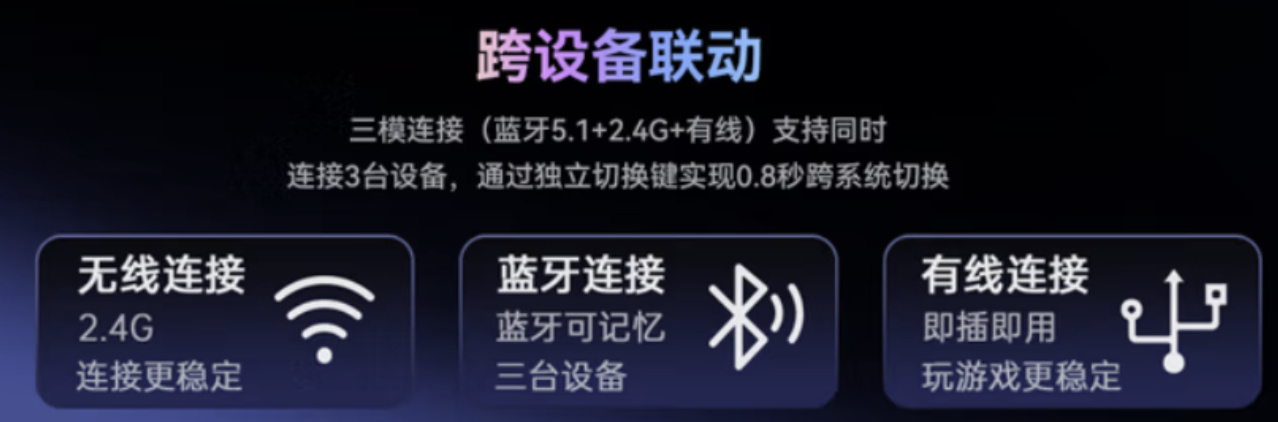 除了上述的无冲,作为一名在宿舍经常开黑的玩家,多连接方式和键盘的响应速度也是游戏体验的一部分。