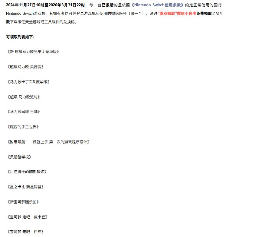 从2024 年11月,“逐步停止网络服务” 的公告发布时,国行 Switch 的 “现代游戏机属性” 就已归零;哪怕是推出了 “回馈计划”可以免费领取至多 4 款下载版游戏,但在玩家看来也较为敷衍,提供的游戏都几乎过气,也没有3A大作