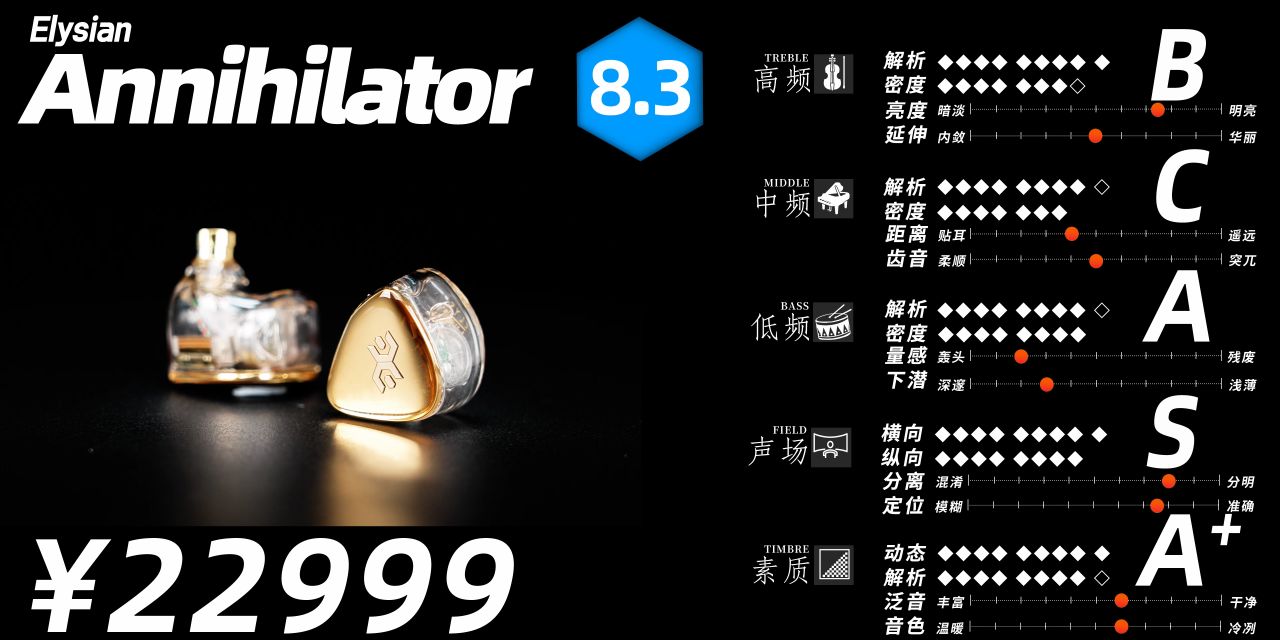 之前聽過21版的殲滅者,給我留下的第一印象就是。虛到不能再虛的中頻人聲。這次的新版殲滅者雖然沒有像之前那麼極端,不過整體還是保持那個調調。高頻華麗明亮,甚至有點過頭,導致略有細碎感。線條感也有些過於突出,缺乏質感和共鳴的表達。中頻稍微拉遠了一些。結像清晰分離都不錯,但是還是密度差勁,有明顯的顆粒和乾澀感,導致聽感非常的慘白。胸聲單薄,氣聲多,人聲明顯的亮薄年輕化,而且齒音較爲突兀和刺激。低頻很多,對人聲也有明顯的一個掩蔽效應。質感、打擊感、動態感都非常頂級,這點沒得說。聲場非常大,而且很規整。