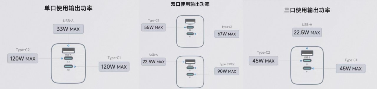 这款充电器拥有3个接口:2C一A,C1和C2最大都拥有120W的输出功率,A口的话功率最大就只有33W了