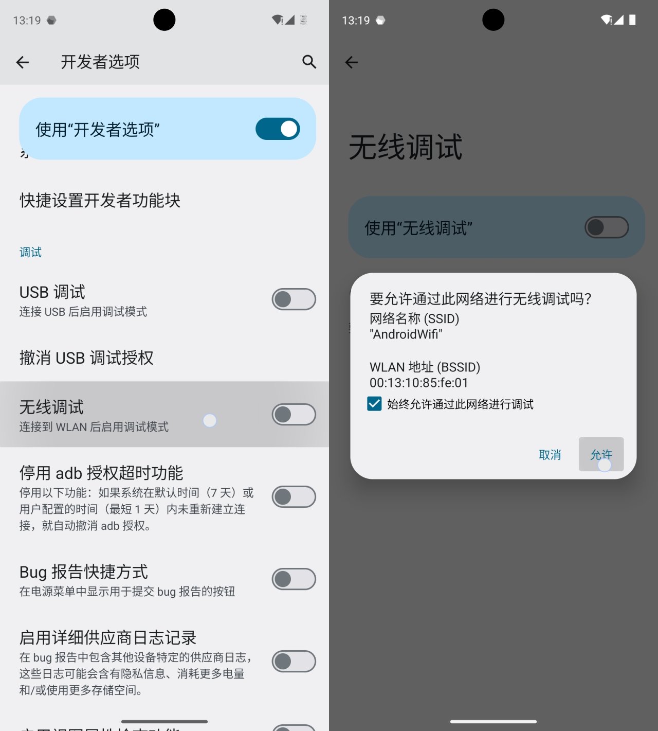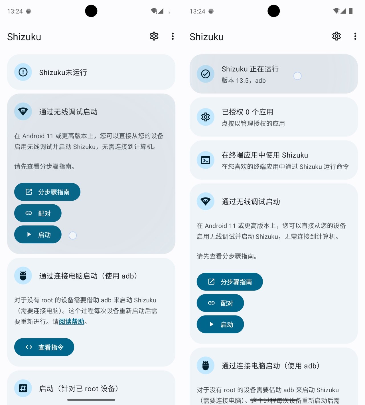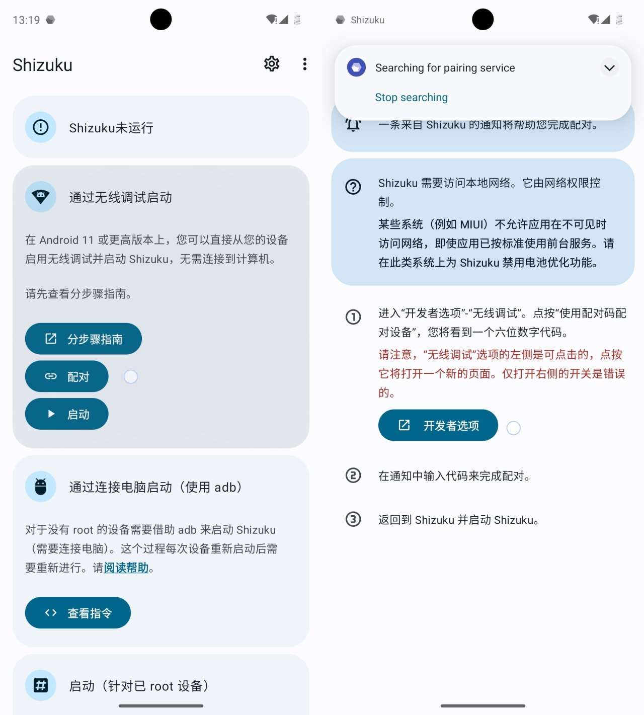 通过无线调试方法启动服务的,不要关闭无线调试,一切权限基于这个开关,关闭后手机重启后需要连接WIFI重新启动服务,不过比第一次启动简单很多:点击“启动”,弹窗中点击“开发者选项”,找到“无线调试”并开启,直接返回到主页等待几秒即可。
