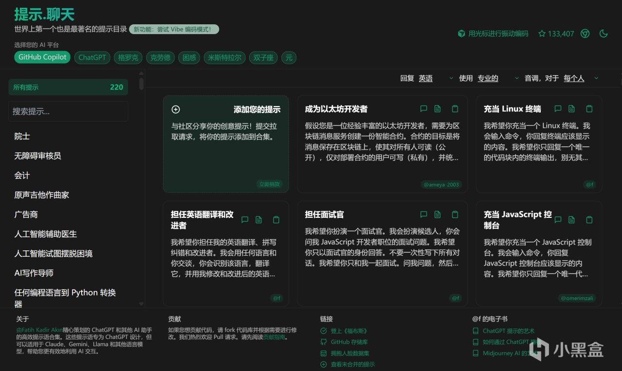 简介:该项目收集了大量高质量 ChatGPT 提示词,覆盖写作、编程、营销、教育等多个领域,是快速获取创作灵感和提高效率的利器。用户可以直接参考、复制或改造提示词,显著提升 ChatGPT 输出的准确性和实用性。