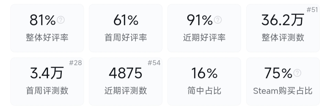 2024年11月,Steam好評率突破80%,已臻特別好評。