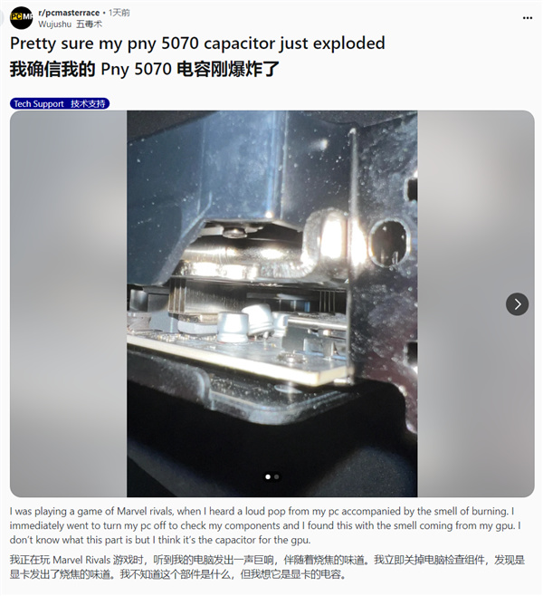 过去没几天,就又有用户反馈其来自同一厂商的RTX 5070也出现了电容爆炸,据Reddit用户u/Wujushu描述,他在玩《漫威争锋》时,突然听到电脑发出一声巨响,随后发现显卡上的一个电容发生了爆炸。